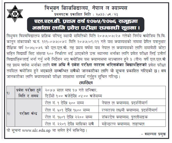 माघ १७ गते शनिबार दिउँसो १ बजेदेखि ४ बजेसम्म प्रवेश परीक्षा हुने क्याम्पसले जनाएको छ। नेपाल ल क्याम्पस प्रदर्शनीमार्ग, रत्नराज्यलक्ष्मी क्याम्पस प्रदर्शनीमार्ग, शंकरदेव क्याम्पस पुतलीसडक र महेन्द्ररत्न क्याम्पस ताहाचलमा परीक्षा केन्द्र तोकिएको छ।