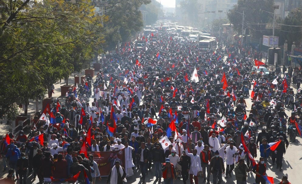 त्यस्तै र्यालीमा सहभागीहरुले ‘अगाडि बढ केपी बा, ज्यान दिन तयार छौं’, ‘साइबर सेना आउँदैछ’ जस्ता नारा लगाएका थिए । उक्त भेला राष्ट्रिय युवा संघले आयोजना गरेको हो। प्रदर्शनले काठमाडौंको सवारी आवागमन प्रभावित भएको छ।