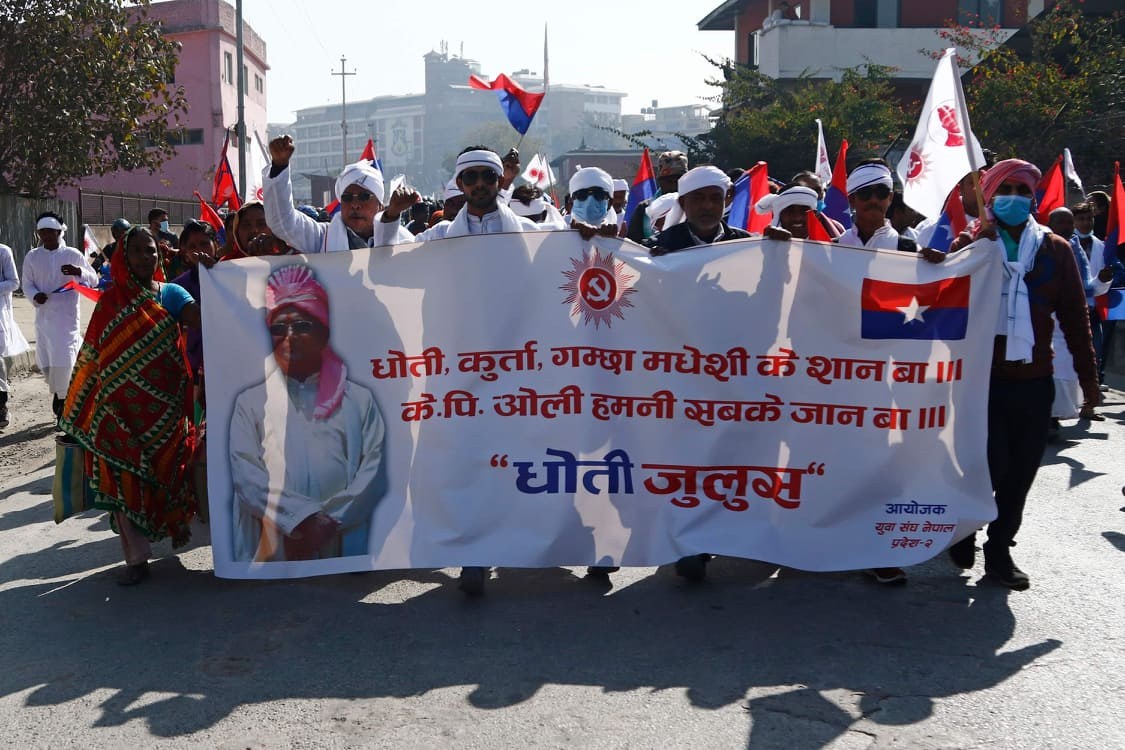 काठमाडौँ । प्रधानमन्त्री केपी शर्मा ओलीको समर्थनमा काठमाडौँमा मधेसका बासिन्दाले प्रदर्शन गरेका छन्। उनीहरुले धोती कुर्ता लगाएर शनिबार प्रधानमन्त्री ओलीको पक्षमा र्याली निकालेका हुन्। उनीहरूले ‘धोती, कुर्ता, गम्छा मधेशीके शान बा, केपी ओली हमनी सबके जान बा’ नारासहित प्रदर्शन गरेका हुन्।