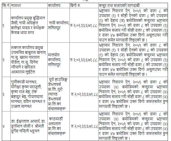 आइतबार आयोगले कर्मचारीहरु मालपोत प्रमुख बुद्धिमान जैसी, नापी अधिकृत बालेश्वर यादव र सर्भेक्षक केशब थापा मगर, तत्कालिन कार्यालय प्रमुख उपसचिव बाबुराम खनाल, नासु ख्याम नारायण पौडेल, नासु दिनेश न्यौपाने र खरिदार आत्माराम लुइटेल विरुद्ध भ्रष्टाचार मुद्दा दायर गरेको हो।