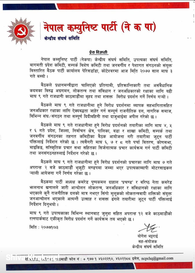 काठमाडौं । नेकपा कम्युनिस्ट पार्टी (नेकपा) को दाहाल–नेपाल समूहले माघ ९ गते काठमाडौँमा जनप्रदर्शन गर्ने भएको छ। आज (शनिबार) पार्टी केन्द्रीय कार्यालय पेरिसडाँडामा बसेको केन्द्रीय संघर्ष समितिको बैठकले काठमाडौँ उपत्यकाका विभिन्न स्थानमा जुलुसहित अपराह्न १२ बजे रत्नपार्कमा एकीकृत प्रदर्शन गर्ने निर्णय गरेको समितिका सह-संयोजक योगेशकुमार भट्टराईले जानकारी दिए।