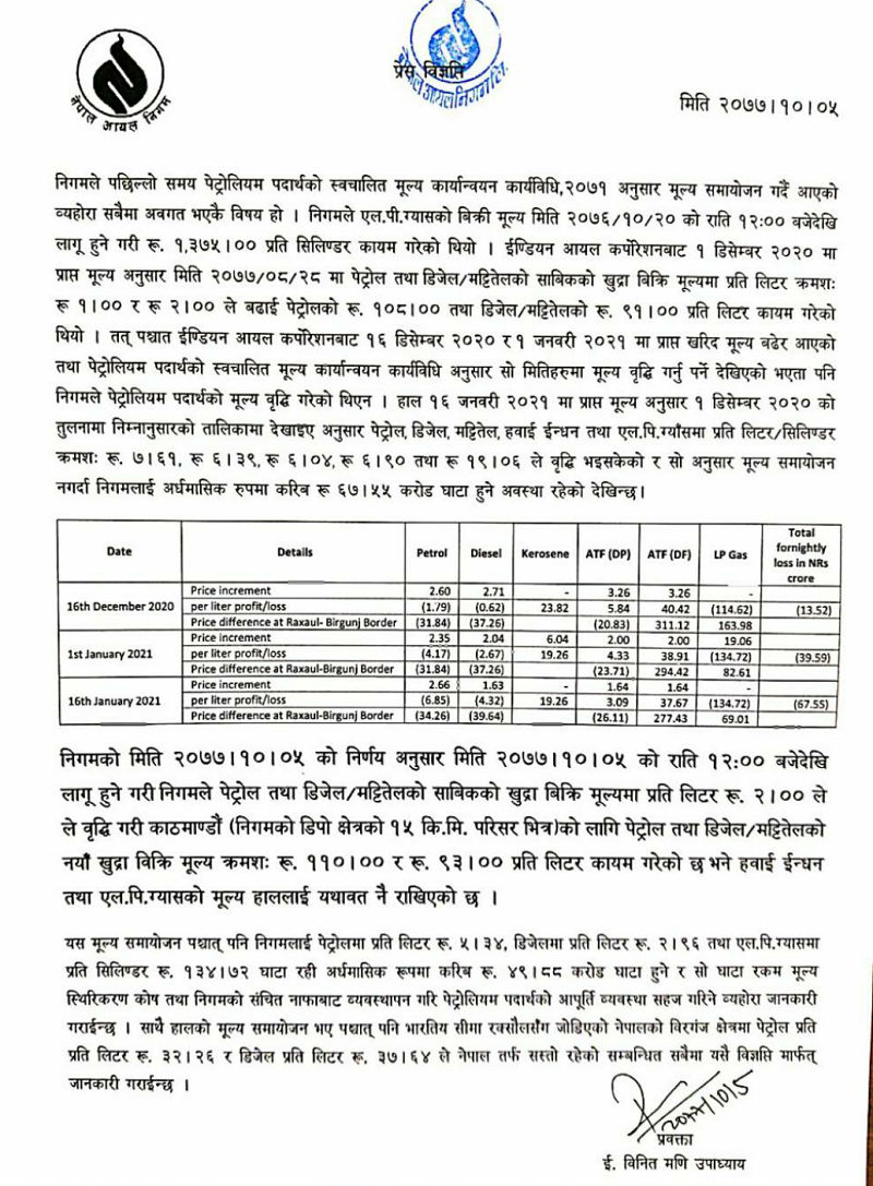 यसअघि प्रति १५ दिनमा इन्धनबाट साढे ६७ करोड रुपैयाँ घाटा हुने देखिएपछि इन्धनको मूल्य समायोजन गरेको निगमका प्रवक्ता विनीतमणि उपाध्यायले जानकारी दिए । अहिले कायम हुने नयाँ बिक्री मूल्यअनुसार निगमलाई अझै पनि प्रति १५ दिनमा ५० करोड रुपैयाँ घाटा छ ।