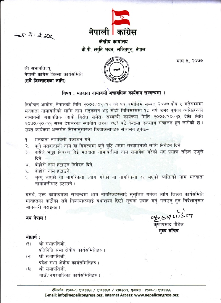 मतदाता नामावली अद्यावधिकमा सहभागी हुन ७७ वटै जिल्लामा कांग्रेसको सर्कुलर