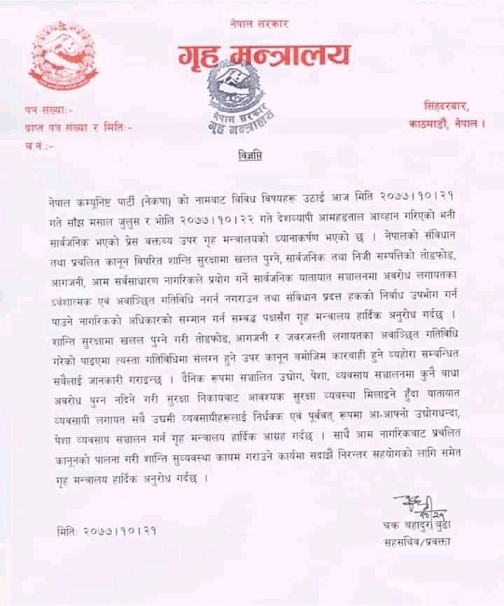 हेर्नुहोस् गृह मन्त्रालयको विज्ञप्ति