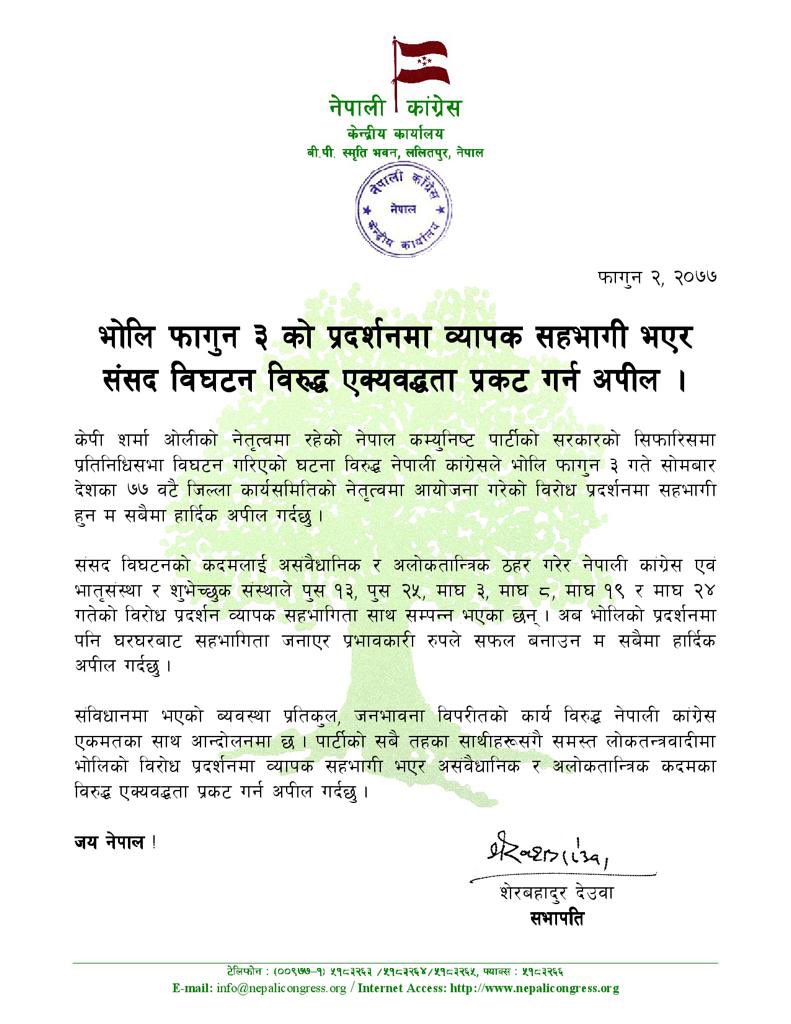 प्रधानमन्त्रीको कदमलाई कांग्रेसले असंवैधानिक र अलोकतान्त्रिक भनेको छ। उनले लोकतन्त्रवादीहरू भोलिको विरोध प्रदर्शनमा व्यापक सहभागी भएर असंवैधानिक र अलोकतान्त्रिक कदमविरूद्ध ऐक्यवद्धता प्रकट गर्न अपिल गरेका छन्।
