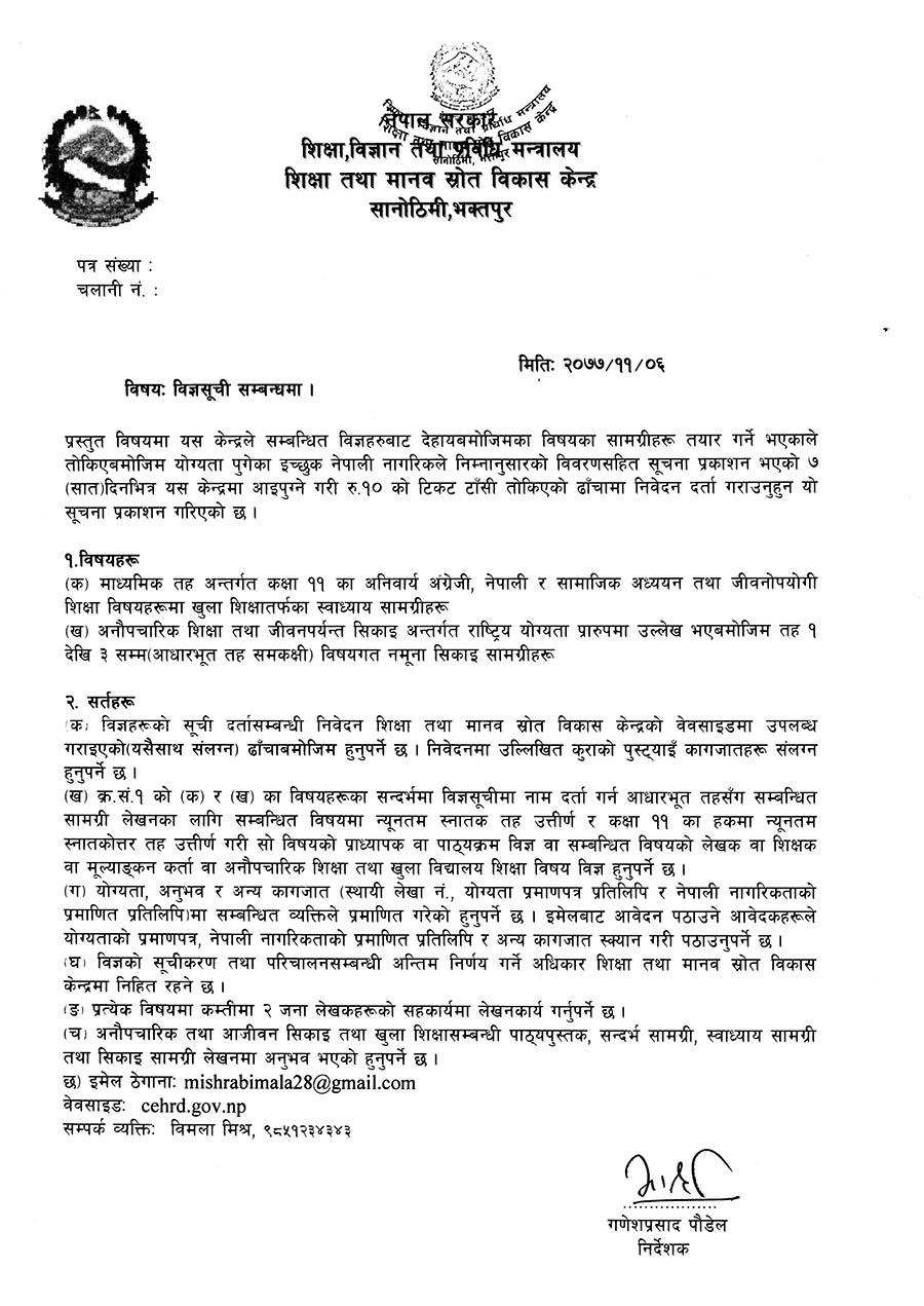 कक्षा ११ का अनिवार्य अंग्रेजी, नेपाली र सामाजिक अध्ययन तथा जीवनोपयोगी शिक्षा विषयका खुला शिक्षातर्फका स्वाध्ययन सामग्रीहरू र अनौपचारिक शिक्षा तथा जीवनपर्यन्त सिकाइ अन्तर्गत राष्ट्रिय योग्यता प्रारुपमा उल्लेख भएबमोजिमका विषयगत नमूना सिकाइ सामग्रीहरू तयार गर्न विज्ञ सूची छनोट गर्न लागिएको हो ।