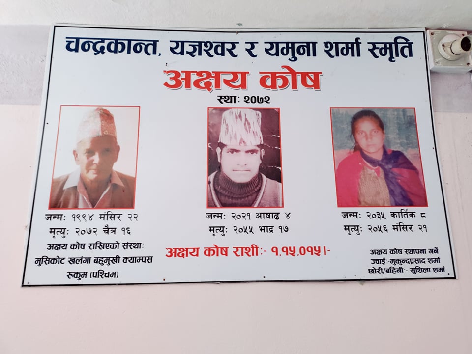 मुसिकोट । मुसिकाेट खलङ्गा बहुमुखी क्याम्पस पश्चिम रूकुमले चन्द्रकान्त, यज्ञश्वर र यमुना शर्मा स्मृति अक्षय काेष वितरण गरेकाे छ । जनयुद्धका प्रथम सहिद दिलबहादुर रम्तेलकाे स्मृति दिवसकाे अवसरमा शुक्रबार उक्त अक्षय काेष बितरण गरिएकाे हाे ।
