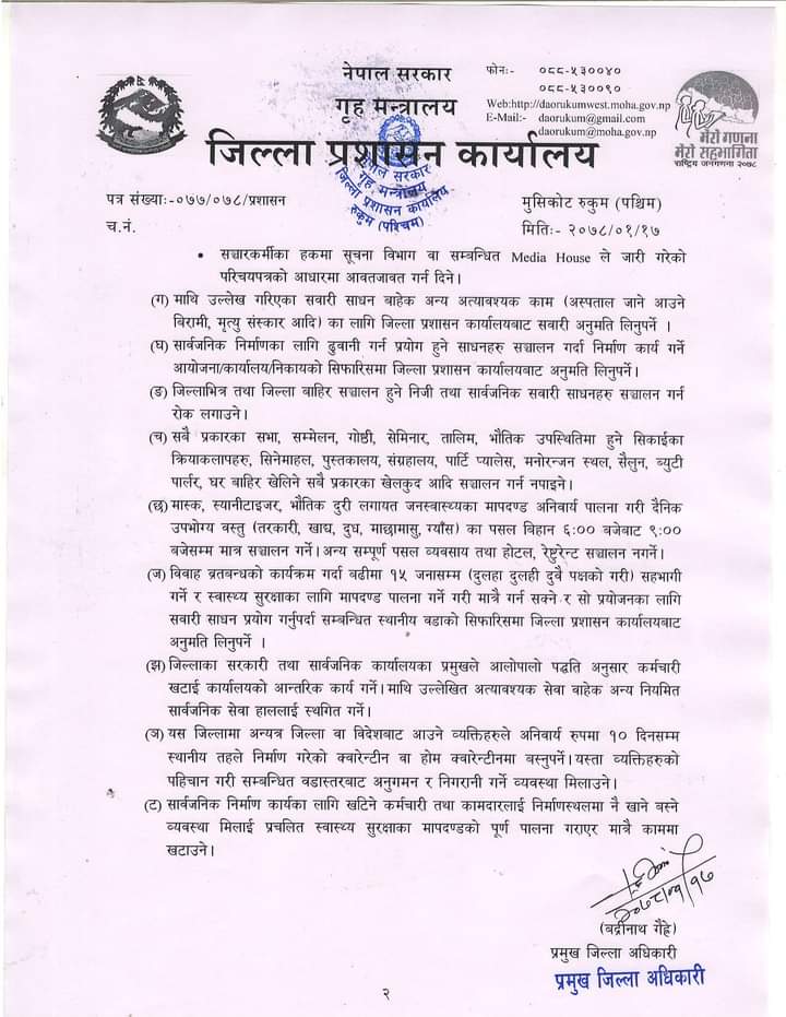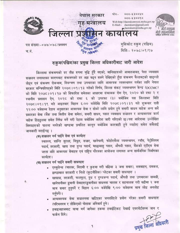 मुसिकोट । बैशाख १९ गते आईतबार देखि लागु हुने गरी रुकुम पश्चिममा निषेधाज्ञा जारी गरिएको छ । शुक्रबार जिल्ला प्रशासन कार्यालय रुकुम पश्चिममा बसेको जिल्ला कोभिड १९ संकट व्यबस्थापन केन्द्रको बैठकले जिल्लामा निषेधाज्ञा जारी गर्ने निर्णय गरेको हो ।