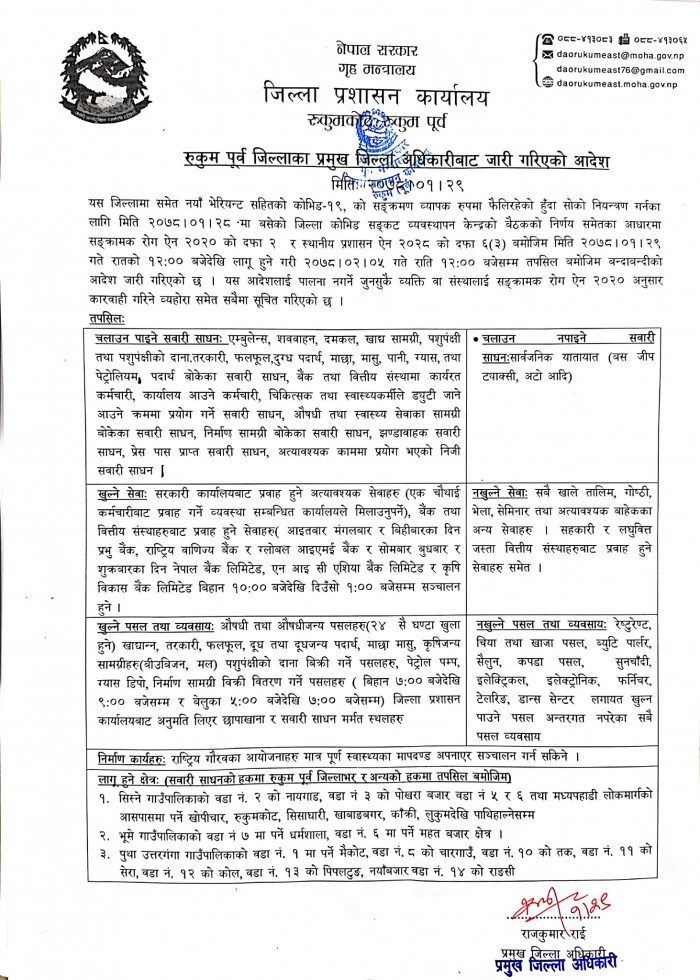 यस्तै अति आवश्यक काम नपरी घर बाहिर नसिस्किन प्रशासनले अनुरोध गरेको छ । आदेश पालना नगर्ने व्यक्ति तथा संस्थालाई संक्रामक रोग ऐन २०२० अनुसार कारवाही गर्ने समेत प्रशासनले चेतावनी दिएको छ ।