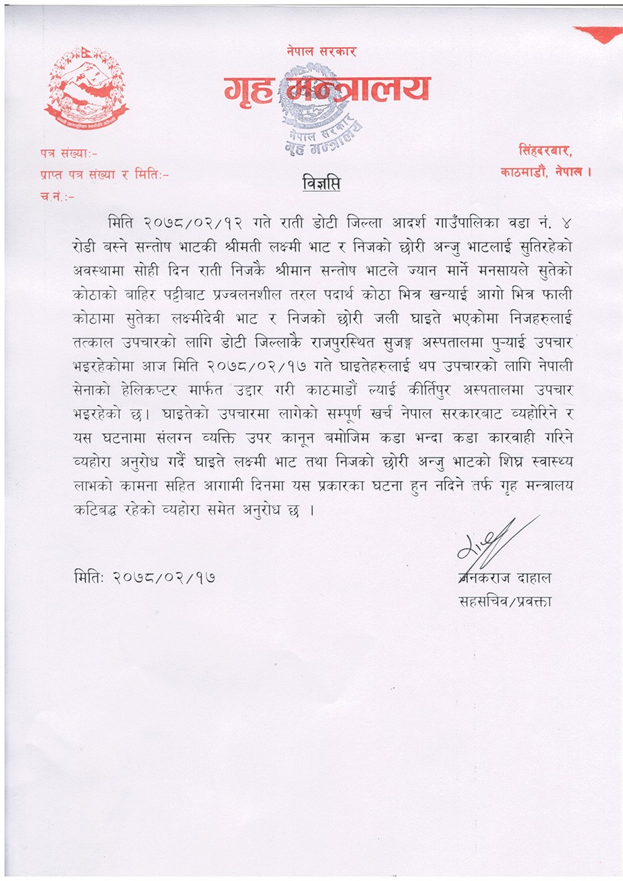 सोमबार गृह मन्त्रालयले जारी गरेको विज्ञप्तिमा आगोले जलेर गम्भीर घाइते भएकी लक्ष्मीको उपचारमा लाग्ने सम्पूर्ण उपचार खर्च बेहोर्ने जनाएको हो । यसैगरी घटनामा संलग्न उनका श्रीमान सन्तोष भाटलाई कानून बमोजिम कडाभन्दा कडा कारबाही गरिने पनि मन्त्रालयले बताएको छ ।
