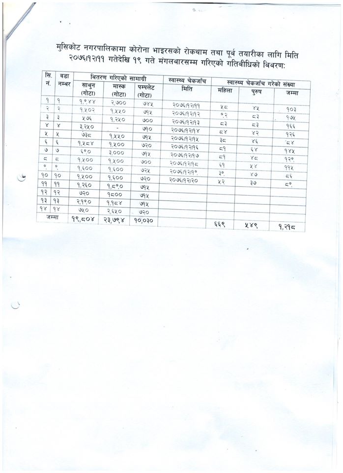 जस अन्तरगत नगरपालिकाले चैत्र ११ गते देखि १९ गतेसम्म डाटाको अनुसार नगरका १४ वटा वडाहरुमा १९ हजार ८ सय ४ साबुन र २३ हजार ७ सय ९४ वटा कपडाको मास्क वितरण गरिएको नगरपालिका निमित्त प्रमुख प्रशासकीय अधिकृत नरविर खड्काले बताउनु भयो । उहाँका अनुसार उक्त सामाग्रीहरु सम्बन्धीत वडा कार्यालयबाट बितरण गरिएको हो ।