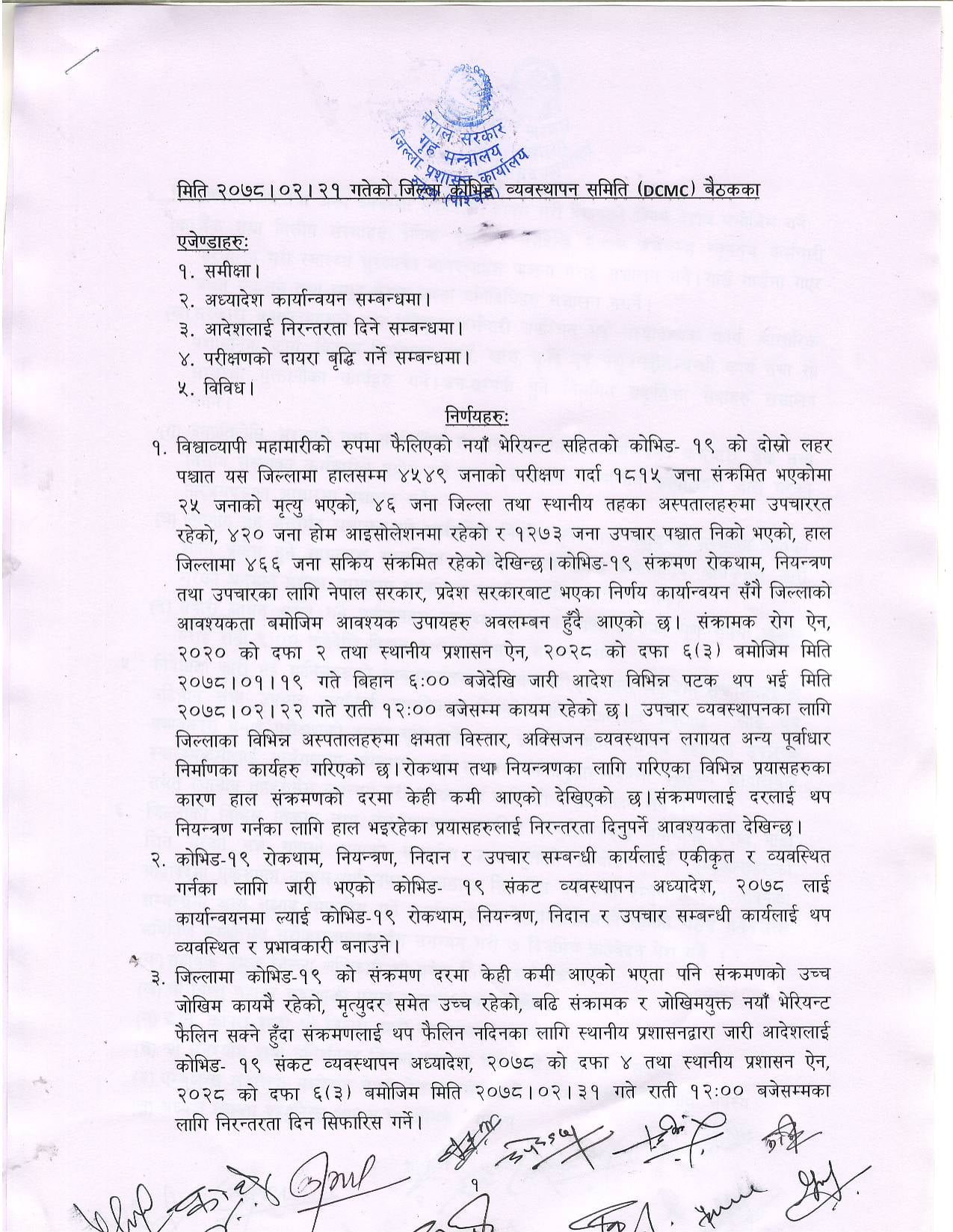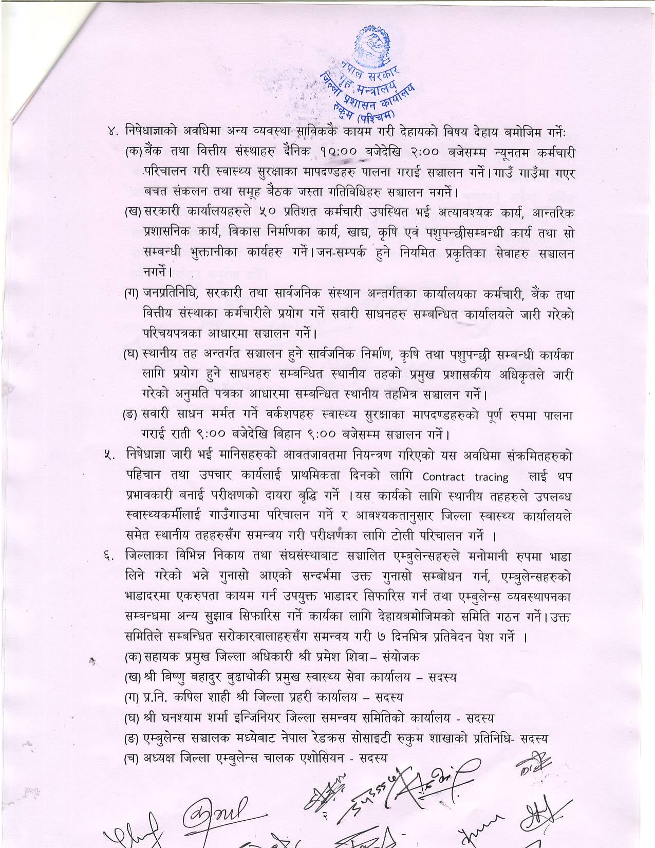 सरकारी कार्यालयले ५० प्रतिशत कर्मचारी उपस्थित गराएर अत्यावयक सेवा प्रवाह गर्ने निर्णय बैठकले गरेको छ । सवारी साधन मर्मत गर्ने वर्कसपहरु बेलुका ९ बजेदेखि बिहान ९ बजेसम्म खोल्ने र एम्बुलेन्सको भाडामा एकरुपता ल्याउन सहायक प्रमुख जिल्ला अधिकारीको संयोजकत्वमा एक समिति समेत बनाईएको छ ।