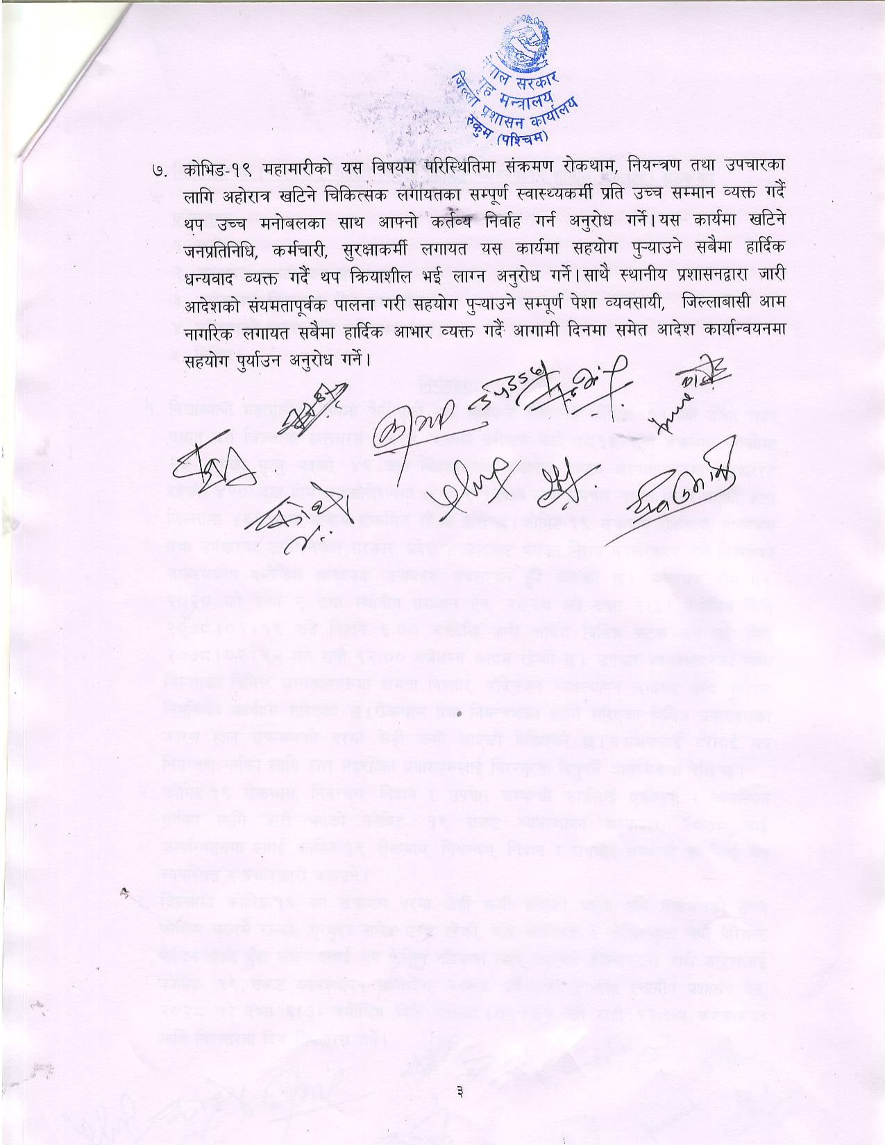 शुक्रबार बसेको जिल्ला कोभिड व्यवस्थापन समितिको बैठकले उक्त निर्णयका अतिरिक्त सरकारी काम र सर्वसाधारणको सहजताको लागि महत्वपूर्ण निर्णय गरेको प्रमुख जिल्ला अधिकारी बद्रिनाथ गैह्रेले बताउनुभयो । बैठकले निषेधाज्ञाको अवधिमा बैक तथा बित्तिय संस्थाहरु हरेक दिन बिहान १० बजेदेखि २ बजे सम्म सञ्चालन गर्ने निर्णय गरेको छ । जसको लागि न्युनतम कर्मचारी परिचालन गरेर स्वास्थ्य सुरक्षाका मापदण्ड अनिवार्य गरिएको छ । यसका साथै बैक तथा बित्तिय सस्थाहरुले यस अवधिमा गाउँमा बचत संकलन तथा समुह बैठक गर्न भने नपाउने भएका छन् ।