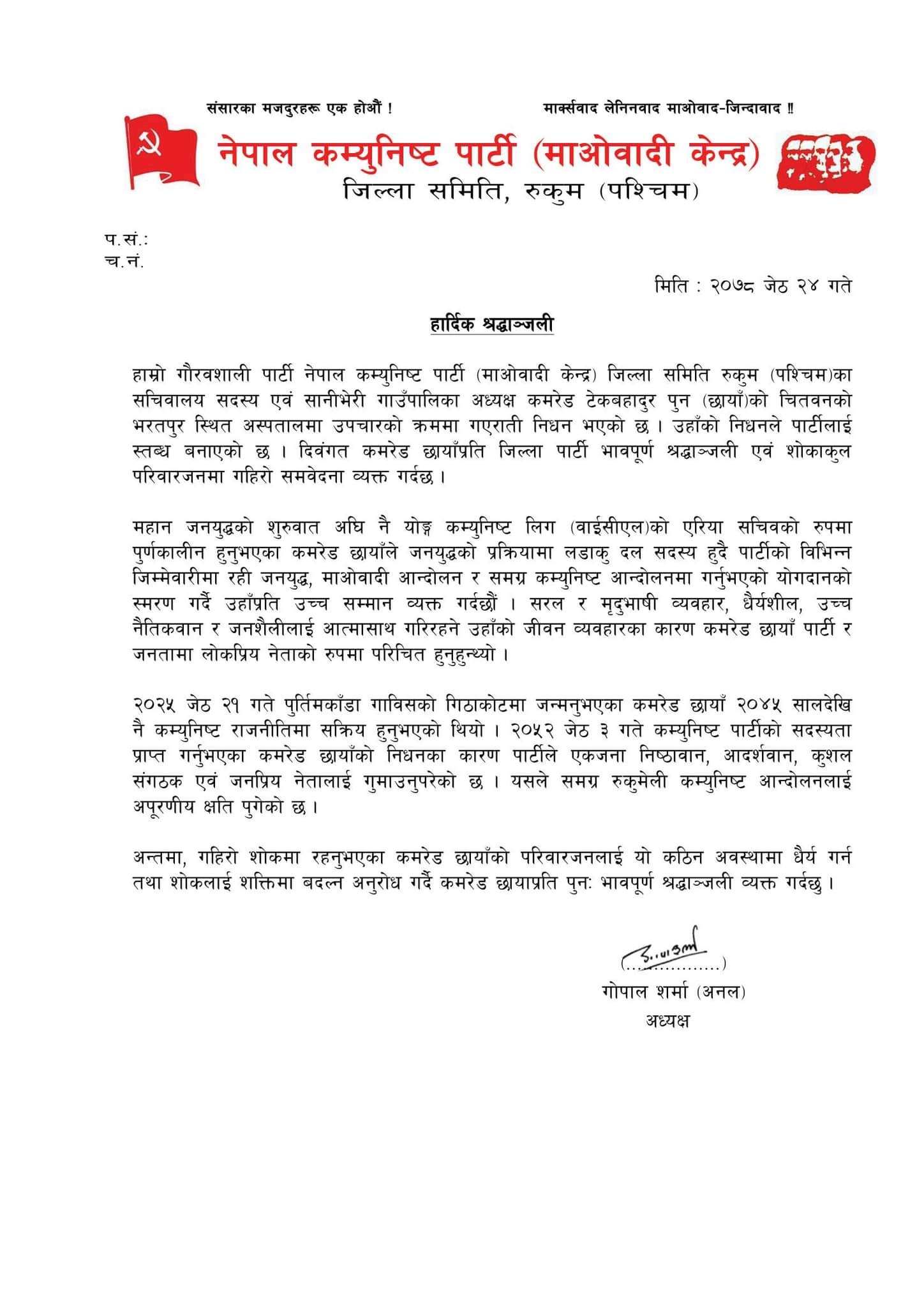 जिल्लाको सानीभेरी गाउँपालिकाका पार्टी अध्यक्ष समेत रहनु भएका उहाँको चितवनको भरतपुर स्थित अस्पतालमा निधन भएको र दुखद् निधनले पार्टी स्तब्ध भएको भन्दै माओबादी केन्द्र रुकुम पश्चिमले श्रद्धाञ्जली व्यक्त गरेको छ । पार्टी अध्यक्ष गोपाल शर्माले एक विज्ञप्ती जारी गर्नुहुदै जनयुद्ध र कम्युनिष्ट आन्दोलनमा उहाँले पु¥याउनु भएको योगदानको उच्च सम्मान व्यक्त गर्नुभएको छ ।