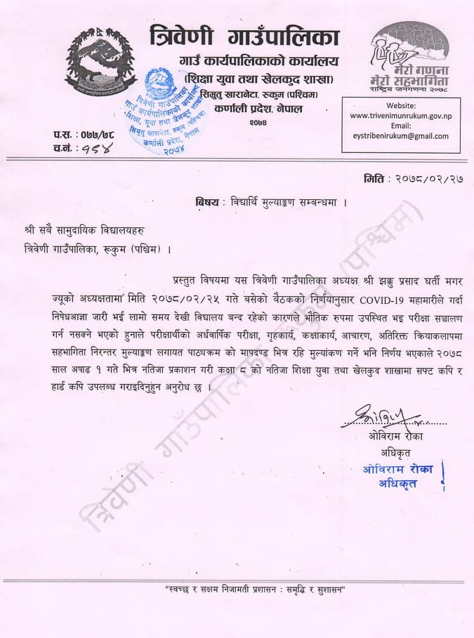 मुसिकोट । रुकुम पश्चिमको त्रिवेणी गाउँपालिकाले असार १ गते भित्र सबै सामुदायिक तथा संस्थागत विद्यालयको आन्तरिक मूल्याँकन गरि नतिजा प्रकाशन गर्न निर्देशन गरेको छ । गाउँपालिकाका अध्यक्ष झक्कु प्रसाद घर्ती मगरको अध्यक्षतामा बसेको बैठकले उपयुक्त मूल्यांकन प्रक्रियाबाट विद्यार्थीको मूल्यांकन गरी असार १ गते भित्रै नतिजा प्रकाशन गर्ने गाउँपालिकाले सबै विद्यालयलाई निर्देशन दिएको हो ।