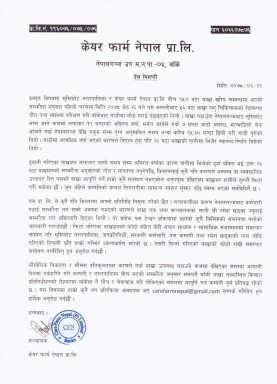 कम्पनिले जारी गरेको विज्ञप्तीमा जेठ २६ गते ५६ ओटा बाख्रा नेपालगञ्जबाट पशु चिकित्सकको रोहवरमा तौल र स्वास्थ्य परिक्षण गरेर पठाईएको कुरा उल्लेख छ । नेपालगञ्जबाट रुकुम पश्चिमको मुसिकोट सम्म बाख्रा लैजााँदा लगातार ११ घण्टा सम्मको अविरल बर्षा, ७ घण्टाको बाटो अवरोध, झण्झटिलो चेकजाँचले गर्दा करिब १५ घण्टा बढी ढिलोगरी गाडि पुगेको कम्पनीले जनाएको छ । पानीमा भिजेका बाख्राको स्वास्थ्य बिग्रिएको र सम्झौता अनुसार बाख्राको तौल र मापदण्ड नपुगेकोले कम्पनीले तुरुन्तै बाख्रा फिर्ता गरेको विज्ञप्तीमा जनाईएको छ ।