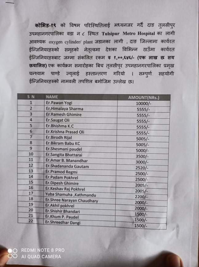 अस्पताललाई १ लाख ६ सय ४६ रुपैयाँ प्रदान गरिएको तुलसीपुर उपमहानगरपालिकामा कार्यरत अटोमोवाइल ईन्जिनियर प्रमोद रेग्मीले बताउँनुभयो ।