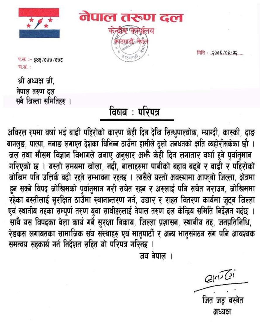 ‘आफ्नो जिल्ला, क्षेत्रमा हुन् सक्ने विपद जोखिमको पूर्वानुमान गरी सचेत रहन र अरुलाई पनि सचेत गराउन, जोखिममा रहेका बस्तीलाई सुरक्षित ठाउँमा स्थानान्तरण गर्न, उद्धार र राहत वितरण कार्यमा जुट्न जिल्ला एवं स्थानीय तहका सम्पूर्ण तरुण युवा साथीहरुलाई नेपाल तरुण दल केन्द्रीय समिति निर्देशन गर्दछ,’ परिपत्रमा लेखिएको छ ।