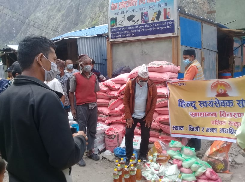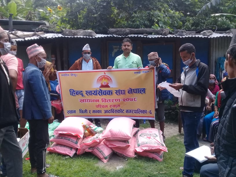 हिन्दु स्वयम् सेवक संघ नेपालले नेपाली काँग्रेस आठबिसकोट नगरपालिकाको समन्वयमा जिल्लाको दुर्गम बस्ती मानिने छिमी, मन्का, ज्यामिरे, ढारथला लगायतका टोलमा पुगेर खाद्यन्न वितरण गरेको हो । नेपाली काँग्रेस आठबिसकोट नगर सभापति कमल शाहका अनुसार डोल्पा र जाजरकोटको सिमानासँग जोडिएका यहाँका गरिब परिवारलाई सम्बन्धित टोलमै पुगेर हिन्दु स्वयम् सेवक संघले खाद्यन्न वितरण गरेको हो ।