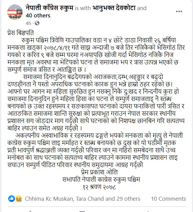 मनकलाको विभत्स हत्या : काँग्रेस रुकुम पश्चिम द्धारा दुःख व्यक्त