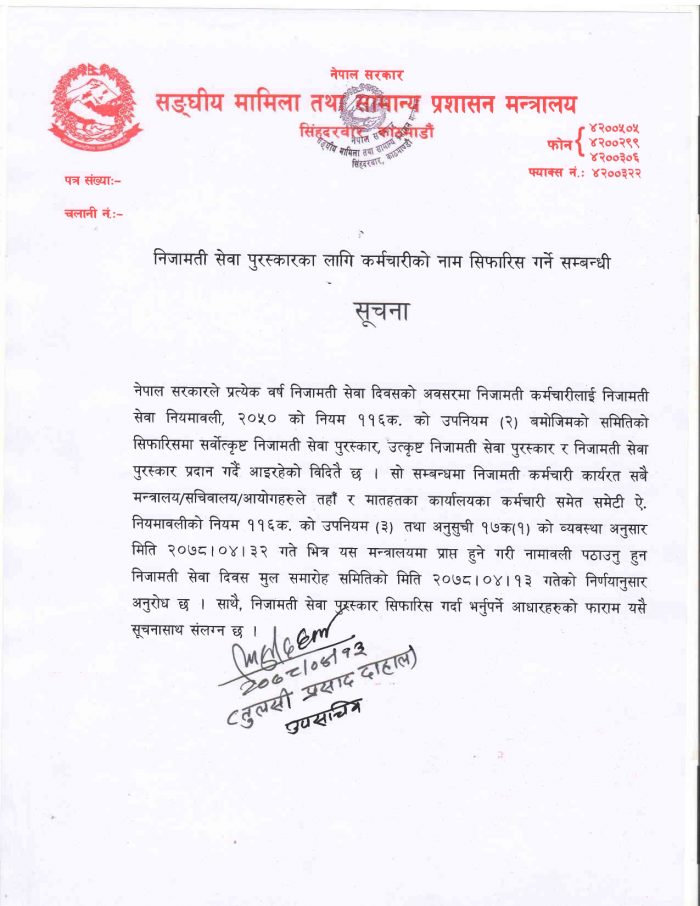 मन्त्रालयका उपसचिव तुलसी प्रसाद दाहालले आज एक सूचना जारी गर्दै निजामती कर्मचारी कार्यरत सबै मन्त्रालय, सचिवालय र आयोगहरूमा कार्यरत कर्मचारी समेत समेटेर साउन ३२ गते भित्र मन्त्रालयमा प्राप्त हुने गरी नामावली पठाउन भनेका छन् । निजामती सेवा दिवस मूल समारोह समितिको साउन १३ गते नामावली पठाउने निर्णय गरेको थियो ।