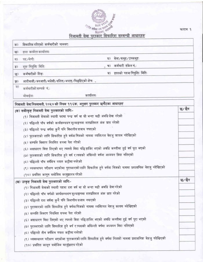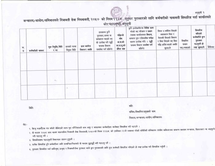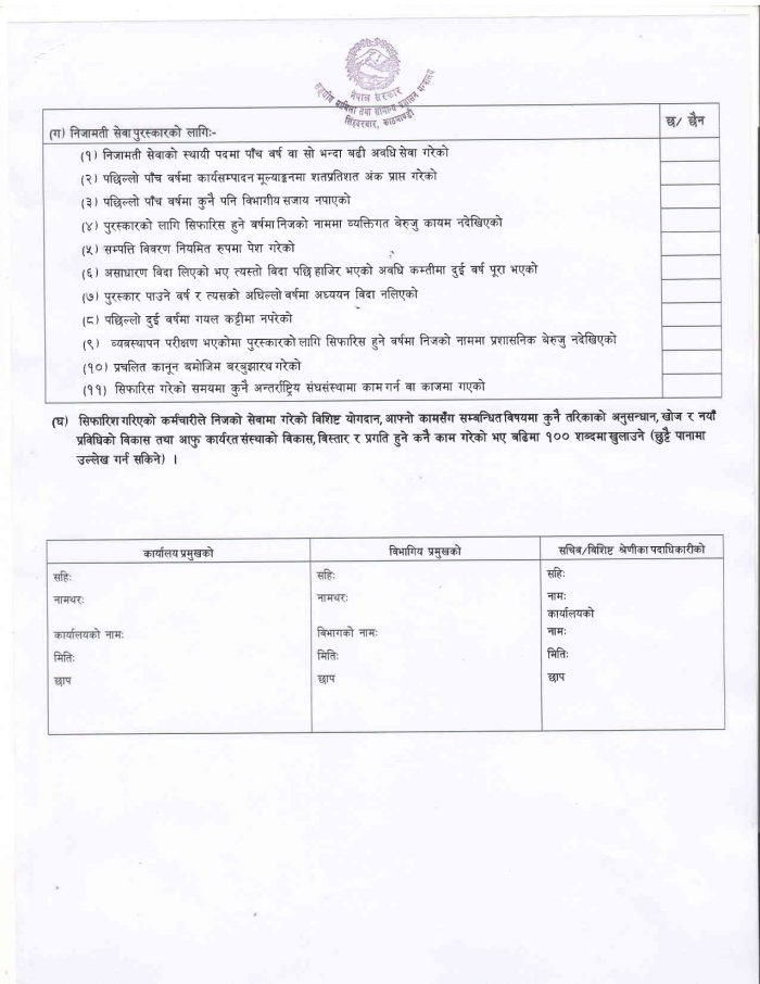 काठमाडौँ । निजामती सेवा पुरस्कारका लागि कर्मचारीको नाम सिफारिस गर्न अनुरोध गरिएको छ । सरकारले प्रत्येक वर्ष निजामती सेवा दिवसको अवसरमा निजामती कर्मचारीलाई प्रदान गर्ने सर्वोत्कृष्ट निजामती सेवा पुरस्कार, उत्कृष्ट निजामती सेवा पुरस्कार र निजामती सेवा पुरस्कारका लागि कर्मचारीको नामावली पठाउन पत्राचार गरेको हो ।