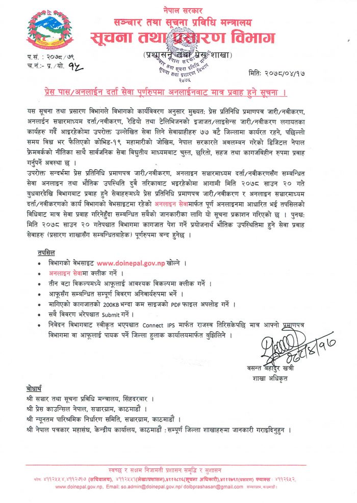 सूचना तथा प्रसारण विभागले विभागको कार्यविवरणअनुसार मुख्यतः प्रेस प्रतिनिधि प्रमाणपत्र जारी–नवीकरण, अनलाइन सञ्चारमाध्यम दर्ता तथा नवीकरणको काम अब अनलाइनबाटै गर्न सकिने भएको छ ।