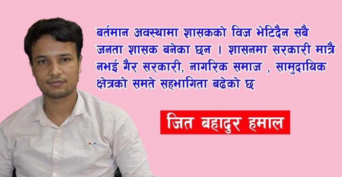 ईतिहासका अरोह अवरोह , युग र कालखण्डहरुमा मानव सभ्यताको विकास सँगै जनताको अमूल्य त्यागहरुको अर्पण गर्दै शासन एक सेवा बनेको छ । आफ्नो कर्म र भुमिकालाई उदारिकृत , जनभावना अनुकुल बनाएको छ । बर्तमान अवस्थामा शासकको विज भेटिदैन सबै जनता शासक बनेका छन । शासनमा सरकारी मात्रै नभई गैर सरकारी नागरिक समाज , सामुदायिक क्षेत्रको समते सहभागिता बढेको छ । शासनका नविन अवधारणाहरुको कार्यन्वयन पक्षमा केहि त्रुटिहरुबाहे कुनै पनि अवगुणहरु देखिदैन्न । मुलुकको विकास , समृद्धि, समुन्ति, सामाजिक न्याय, समानता स्वतन्त्रता, राप्ट्रिय सवलता र सक्षमता विकास, राजनैतिक स्थिरता, मानव विकास, दिगो विकास, विकासशील राष्ट्र निमार्ण गर्न, लोक कल्यानलाई आत्मसाथ गदै अन्तराष्ट्रिय जगतमा राष्ट्रिय स्वार्थ र पहिचान अभिवृद्धि गर्नका लागि समय परिस्थिति र समाथ्र्य अनरुपको शासन ब्यवस्था अङगाल्नु आजको आवश्यकता हो । लेखक हमाल प्यूठान नगरपालिकामा कार्यरत हुनुहुन्छ ।
