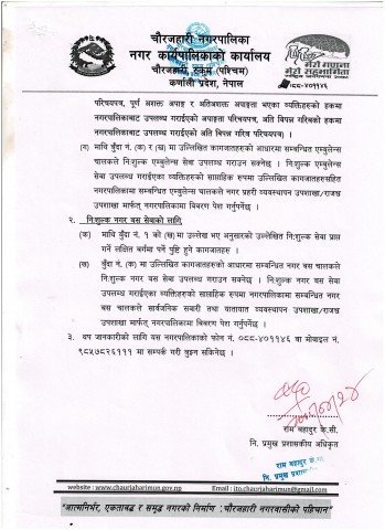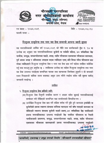 केहि दिनअघि नगरपालिकाका निमित्त प्रमुख प्रशासकीय अधिकृत रामबहादुर केसीले एक सूचना जारी गर्दै नि:शुल्क नगर बस र एम्बुलेन्स सेवाको बारेमा विस्तृत जानकारी दिनुभएको छ । यसैगरी पूर्ण अशक्त, अति अशक्त भएका व्यक्ति र अतिविपन्न परिचयपत्र प्राप्त गरेका व्यक्तिलाई पनि निःशुल्क नगर बस र एम्बुलेन्स सेवा दिइनेछ ।