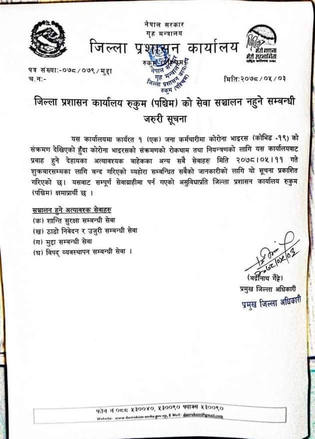 मुसिकोट । जिल्ला प्रशासन कार्यालय रुकुम पश्चिमले शुक्रबारदेखि अत्यावश्यक बाहेकका सेवा बन्द गरेको छ । जिल्ला प्रशासन कार्यालय रुकुम पश्चिममा कार्यरत एकजना कर्मचारीमा कोरोना भाइरस (कोभिड-१९) को संक्रमण देखिएपछि भदौ ११ गते सम्मका लागि कार्यालय बन्द गरिएको प्रमुख जिल्ला अधिकारी बद्रीनाथ गैह्रेले जानकारी दिनुभयो ।