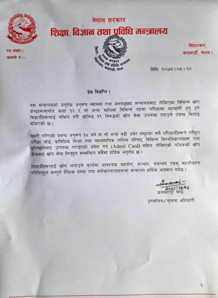 विज्ञप्तिमा लेखिएको छ, ‘शिक्षा मन्त्रालयको अनुरोध अनुरुप स्वास्थ्य तथा जनसंख्या मन्त्रालयबाट तोकिएका विभिन्न खोप केन्द्र मार्फत कक्षा १२ र सो भन्दा मागिका विभिन्न तहका परीक्षामा सहभागी हुनुहुने विद्यार्थीहरुलाई लक्षित गरि कोभिड–१९ विरूद्ध गराउने प्रबन्ध मिलाई सकिएको छ ।’