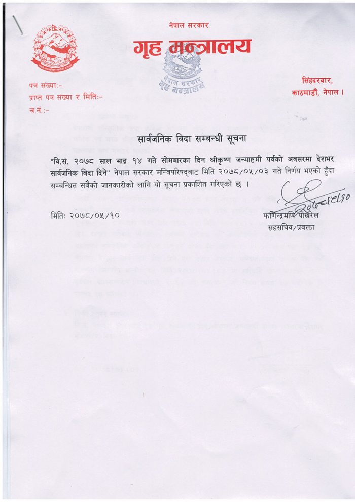 सरकारले यही १४ गते सार्वजनिक बिदा दिएको छ । श्रीकृष्ण जन्माष्टमी परेकाले आउँदो सोमबार सार्वजनिक बिदा दिने निर्णय भएको गृहमन्त्रालयले जनाएको छ ।