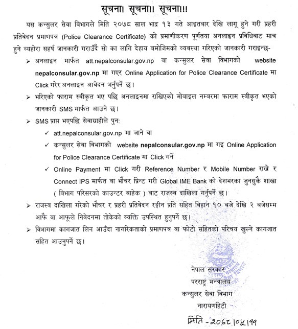 “काठमाडौँबाहेक देशका कुनै पनि स्थानमा कन्सुलर सेवा विभागबाट प्रवाह हुने सेवाको व्यवस्था हालसम्म नभएकाले ताप्लेजुङदेखि दार्चुलासम्मका सेवाग्राहीलाई पहिलो चरणमा ‘पुलिस क्लियरेन्स सर्टिफिकेट’ प्रमाणीकरणको व्यवस्था अनलाइनबाट गरिएको छ ।