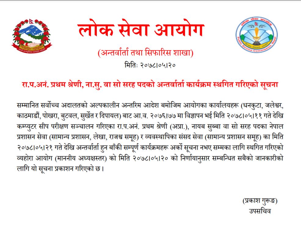 आयोगका अध्यक्षस्तररीय बैठकको निर्णयले धनकुटा, जलेश्वर, काठमाडौं पोखरा, बुटवल, सुर्खेत र दिपायलबाट आर्थिक वर्ष २०७६-०७७ मा विज्ञापन भई २०७८-०५-११ गतेदेखि कम्प्युटर सीप परीक्षण सञ्चालन गरिएको राजपत्र अनङ्कित प्रथम श्रेणी (अप्रा), नायब सुब्बा वा सो सरह पदका नेपाल प्रशासन सेवा (सामान्य प्रशासन, लेखा, राजश्व समूह० र व्यवस्थापिका संसद् सेवा, सामान्य प्रशासन समूह) का मिति २०७८-०५-२१ गतेदेखि अन्तर्वार्ता हुन बाँकी सम्पूर्ण कार्यक्रम स्थगित गरेको हो ।