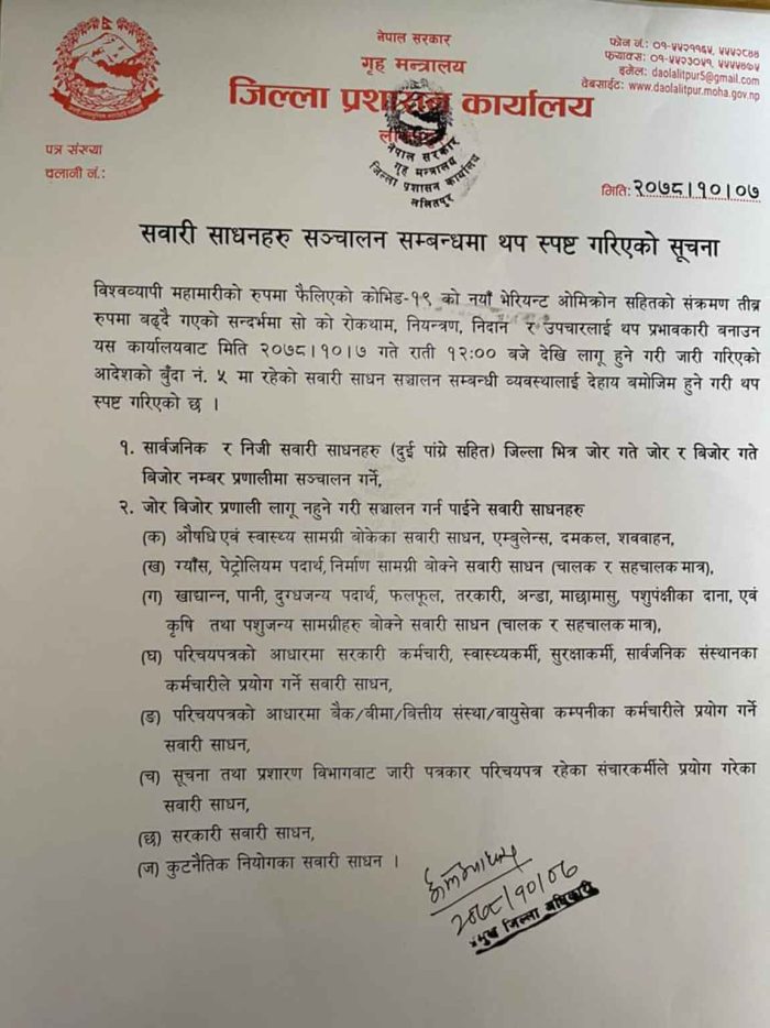 परिचयपत्रको आधारमा सरकारी कर्मचारी, स्वास्थ्यकर्मी, सुरक्षाकर्मी, सार्वजनिक संस्थानका कर्मचारीहरुले आफ्नो सवारी साधन सञ्चालन गर्न पाउने छन् भने परिचयपत्रको आधारमा बैंक, बीमा, वित्तीय संस्था, वायुसेवा, कम्पनीका कर्मचारीले प्रयोग गर्ने सवारी साधनमा पनि जोरबिजोर लागू हुने छैन ।