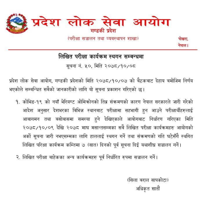 काठमाडौँ । कोरोना संक्रमणको जोखिम बढेसँगै प्रदेश लोकसेवा आयोग गण्डकी प्रदेशको यही माघ ९ गतेदेखि माघ मसान्त सम्म हुने लिखित परीक्षा अर्को सूचना जारी नभएसम्मका लागि स्थगित गरिएको छ ।