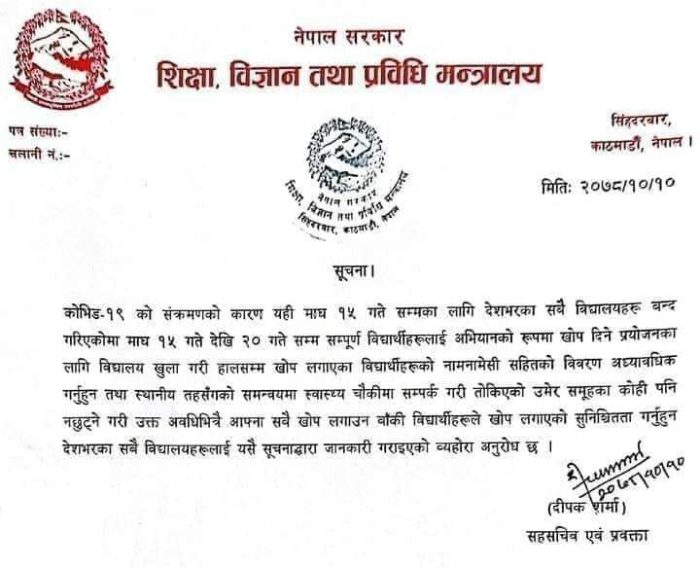 कोरोना बढेपछि सरकारले विद्यालय बन्द गरेको थियो। मन्त्रालयका प्रवक्ता दीपक शर्माका अनुसार स्थानीय तह र स्वास्थ्य चौकीसँग समन्वय गरी देशैभरका विद्यालयहरूले विद्यार्थीलाई खोप लगाउनुपर्नेछ।