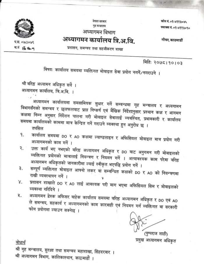 अराइभल कक्ष र डिपार्चर कक्षमा खटिएका कर्मचारीले कार्यालय समयमा ल्यान्डलाइन र अफिसियल मोबाइल मात्र प्रयोग गरी अध्यागमनको काम गर्न कार्यालयले निर्देशन दिएको छ । उक्त कार्य भए/नभएको भने वरिष्ठ अध्यागमन अधिकृतले अनुगमन गर्न र मोबाइलको व्यक्तिगत प्रयोगको मात्रालाई नियन्त्रण तथा नियमन गर्नुपर्ने गरी सूचना जारी भएको छ ।