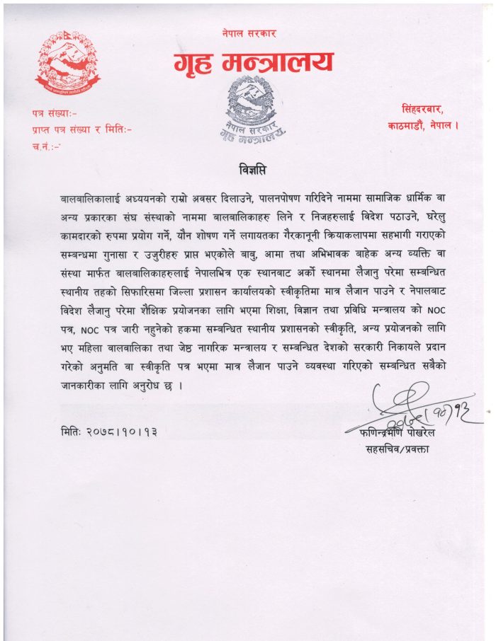 सोमबार गृह मन्त्रालयले विज्ञप्ति जारी गर्दै आमा-बुवा र अभिभावकबाहेक अन्य व्यक्ति वा संस्थामार्फत् बालबालिकाहरूलाई नेपालभित्र एक स्थानबाट अर्कोमा लैजानु परेमा सम्बन्धित तहको सिफारिस लिन भनिएको छ। सो सिफारिस जिल्ला प्रशासन कार्यालयको स्वीकृतिमा मात्रै लैजान पाउने मन्त्रालयले जनाएको छ।