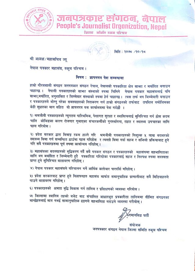 जनपत्रकार संगठनको तर्फबाट जिल्ला संयोजक गमानसिं घर्तिद्वारा हस्ताक्षरित ज्ञापनपत्र महासंघका अध्यक्ष लक्ष्मण केसीलाई बुझाईएको हो ।