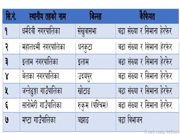 वडा विभाजन तथा वडा संख्या र सिमाना हेरफेरका लागि प्रक्रिया अघि बढाउने स्थानीय तहमा संखुवासभाको धर्मदेवी नगरपालिका, धनकुटाको महालक्ष्मी नगरपालिका, इलामको इलाम नगरपालिका, उदयपुरको बेलका नगरपालिका, खोटाङको जन्तेढुंगा गाउँपालिका, रुकुम पश्चिमको सानोभेरी गाउँपालिका र बझाङको मष्टा गाउँपालिका रहेका छन् ।