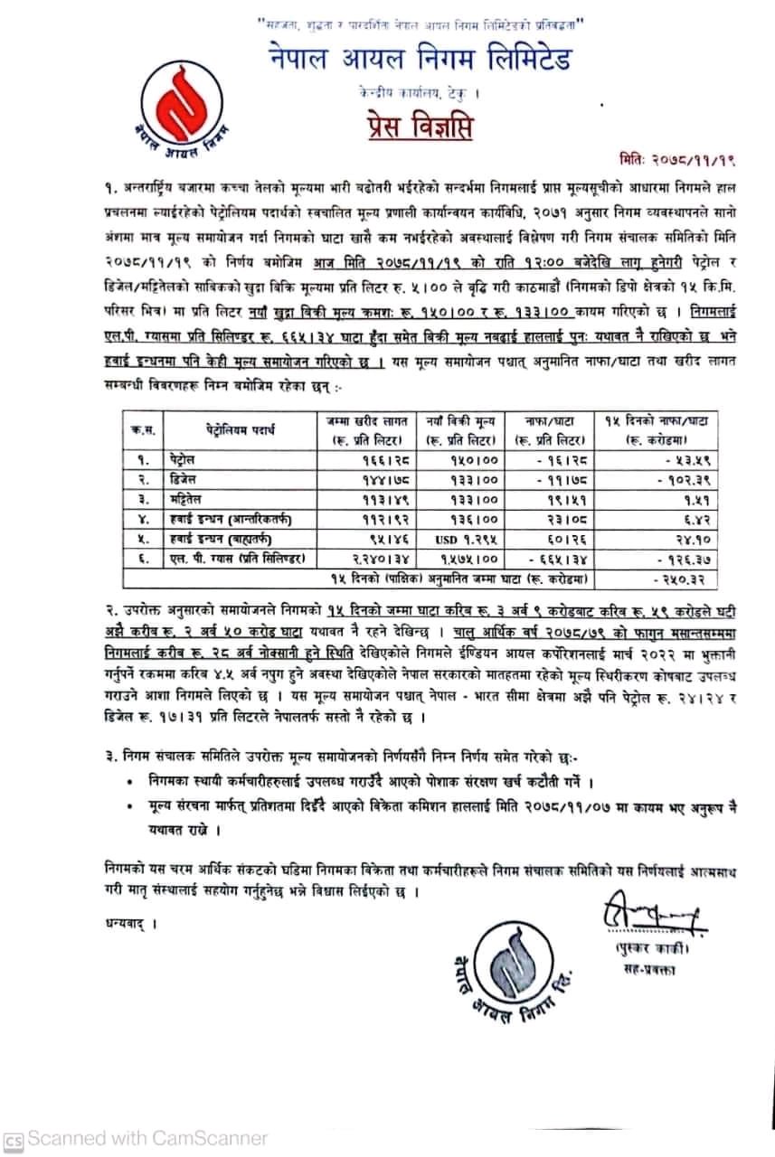 निगमका अनुसार ५-५ रूपैयाँ मूल्य बढे पनि पेट्रोलमा अझै ११ रूपैयाँ २८ पैसा घाटा छ। यस्तै डिजेलमा ११ रूपैयाँ ७८ पैसा घाटा र मट्टितेलमा १९ रूपैयाँ ५१ पैसा फाइदा छ।