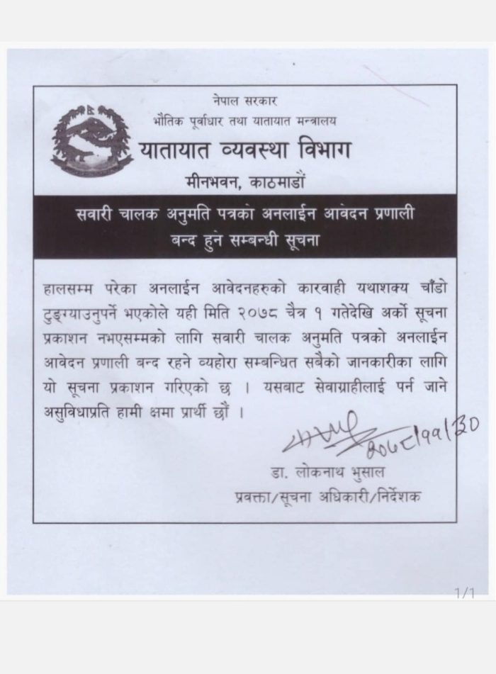 आज चैत १ गते मंगलबारदेखि सवारी चालक अनुमतिपत्र (लाइसेन्स) का लागि नयाँ आवेदन बन्द हुने भएको छ। यातायात व्यवस्था विभागले सूचना निकालेर अर्को सूचना नआएसम्मका लागि अनलाइन आवेदन बन्द हुने जनाएको हो।