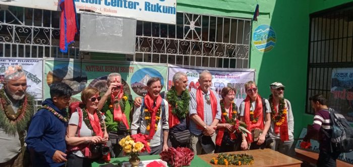 उद्योग वाणिज्य सङ्घ र नेपाल पर्यटन सूचना केन्द्र रुकुमको समन्वयमा पहिलो पटक रुकुम भ्रमणमा आएका विदेशी पर्यटकलाई स्वागत गरिएको सूचना केन्द्रका अध्यक्ष दीपकराज खड्काले बताउनुभयो ।