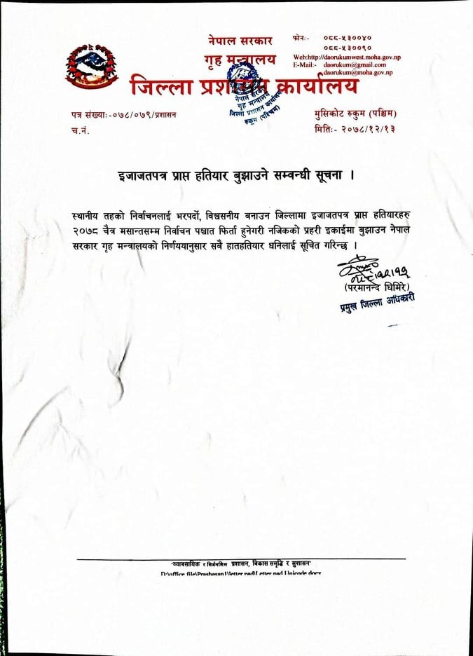मुसीकोट । आगामी वैशाख ३० गते हुने स्थानीय तहको निर्वाचनलाई भयरहित, शान्तिपूर्ण र निष्पक्ष बनाउने उद्देश्यले जिल्ला प्रशासन कार्यालय रुकुम पश्चिमले जिल्लाभित्रै इजाजत प्राप्त गरी विभिन्न व्यक्तिको नाममा रहेका हातहतियार बुझाउन आग्रह गरेको छ।
