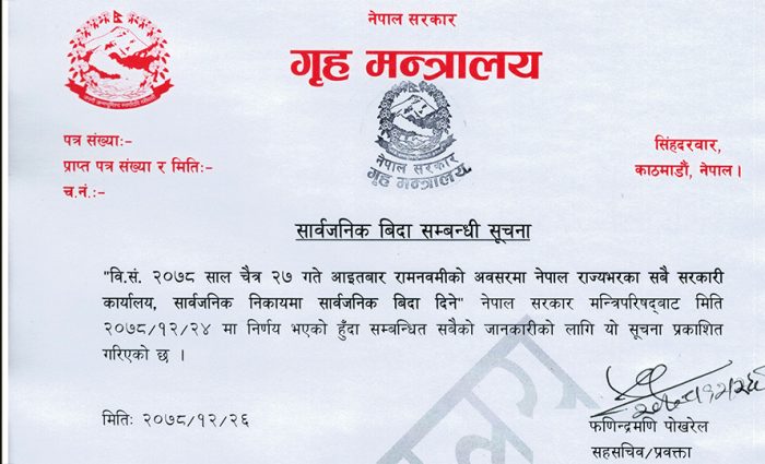 गृह मन्त्रालयले शनिबार सूचना प्रकाशन गरी रामनवमीको अवसरमा देशभरका सरकारी कार्यालय, सार्वजनिक निकायमा सार्वजनिक विदा दिने निर्णय गरेको उल्लेख गरेको छ ।