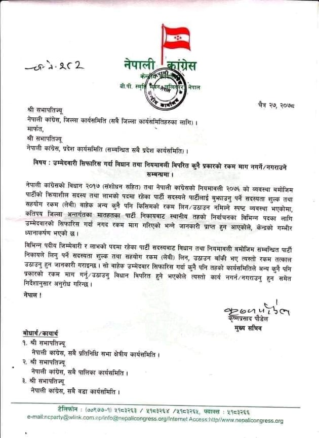 सो व्यवस्था विपरीत केही जिल्लाअन्तर्गत मातहतका पार्टी निकायबाट उम्मेदवारको सिफारिस गर्दा नगद रकम माग गरिएको भन्ने जानकारी आएपछि सो सर्कुलर गरिएको पार्टी कार्यालय मुख्यसचिव कृष्णप्रसाद पौडेलले जानकारी दिनुभयो ।