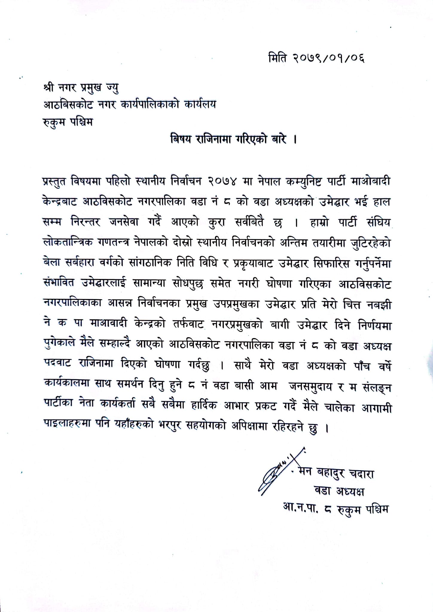 २०७४ को स्थानीय तहको चुनावमा माओवादी केन्द्रबाट उम्मेदवार भई निर्वाचित हुनुभएका वडाध्यक्ष चदाराले आज आठविसकोट नगरपालिकाका प्रमुखलाई सम्बोधन गर्दै वडा अध्यक्ष पदबाट राजीनामा दिनुभएको छ ।