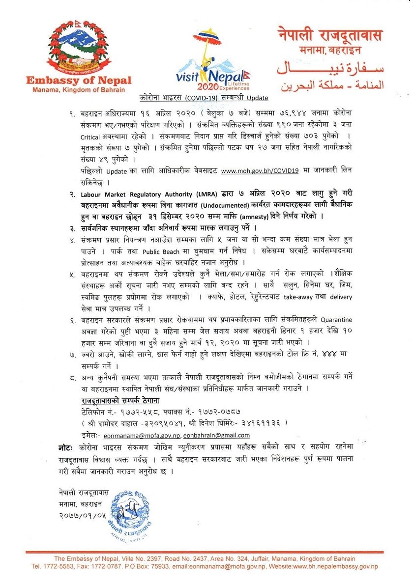 बहराइनमा आज थप २७ जना नेपालीमा कोरोना संक्रमण देखिएको छ । बहराइनको मनामास्थित नेपाली दूतावासले आज शुक्रबार एक विज्ञप्ति जारी गरि थप २७ जना नेपालीलाई कोरोना संक्रमण देखिएको जनाएको छ।