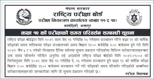 यसअघि बोर्डले बिहान ११ बजेदेखि दिउँसो २ बजेसम्म परीक्षा गर्ने निर्णय गर्दै सूचना सार्वजनिक गरेको थियो।